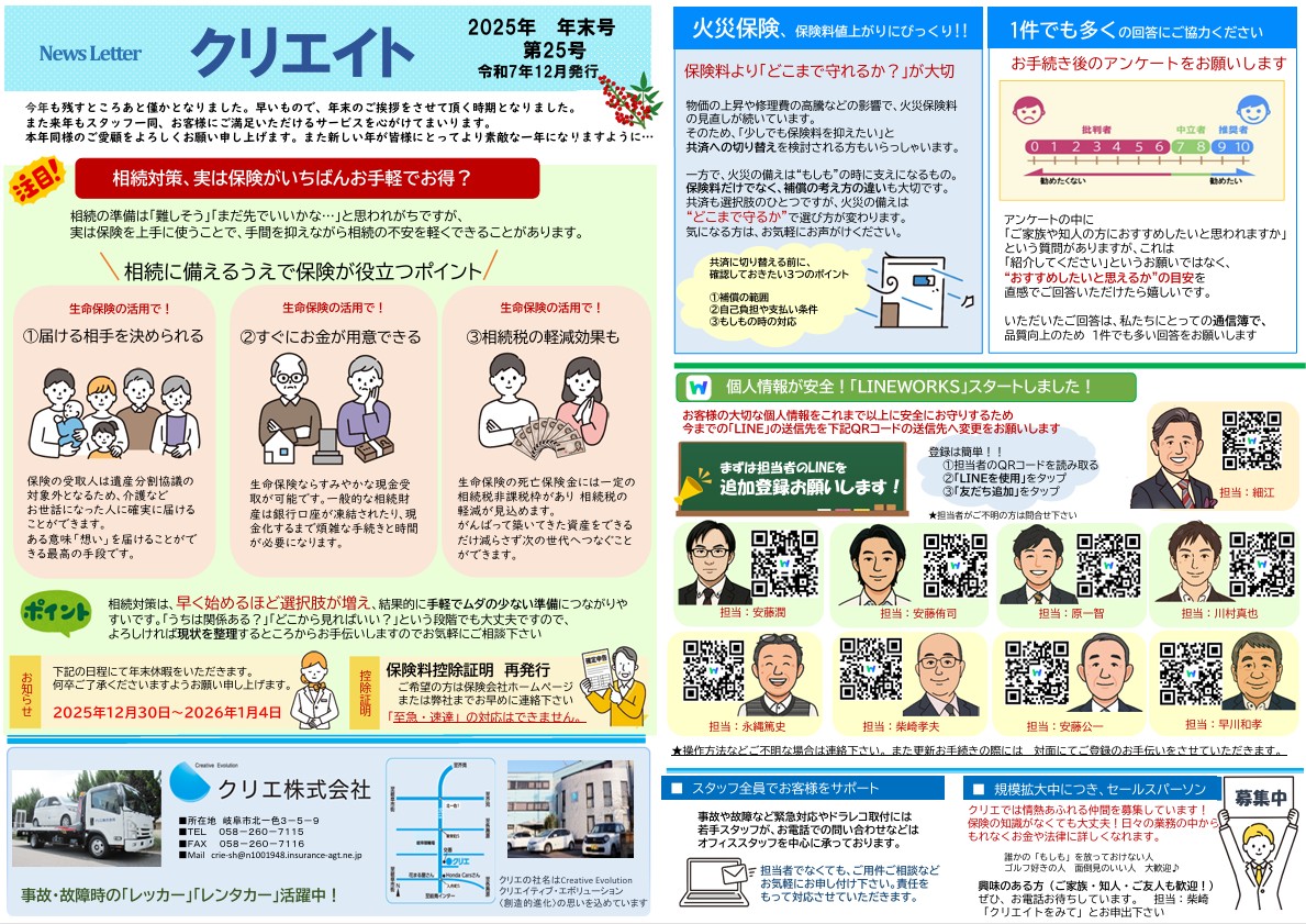 いつもホームページをご覧いただき、ありがとうございます。ニュースレター「クリエイト25号」を発送いたしました。 今年も多くのご縁をいただき、心より感謝申し上げます。来年も、皆さまのお役に立つ情報をお届けできるよう努めてま […]